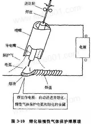 工作原理及特点:焊丝通过丝轮送进,导电嘴导电,在母材与焊丝之间产生电弧,使焊丝和母材熔化,并用惰性气体氩气保护电弧和熔融金属来进行焊接的。